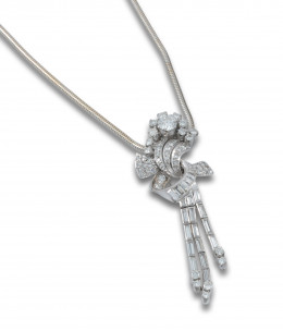 BROCHE CLIP, AÑOS 50, DE DIAMANTES, EN ORO BLANCO CON CADENA